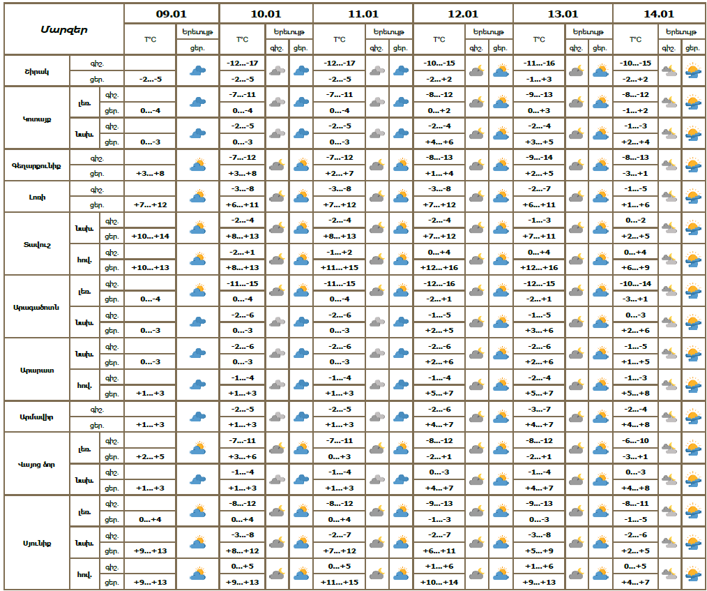 Հունվարի 9-ի ցերեկը, 10-14-ին սպասվում է առանց տեղումների եղանակ: Շիրակում, Արագածոտնում և Կոտայքում սպասվում է մառախուղ, ճանապարհներին` մերկասառույց։