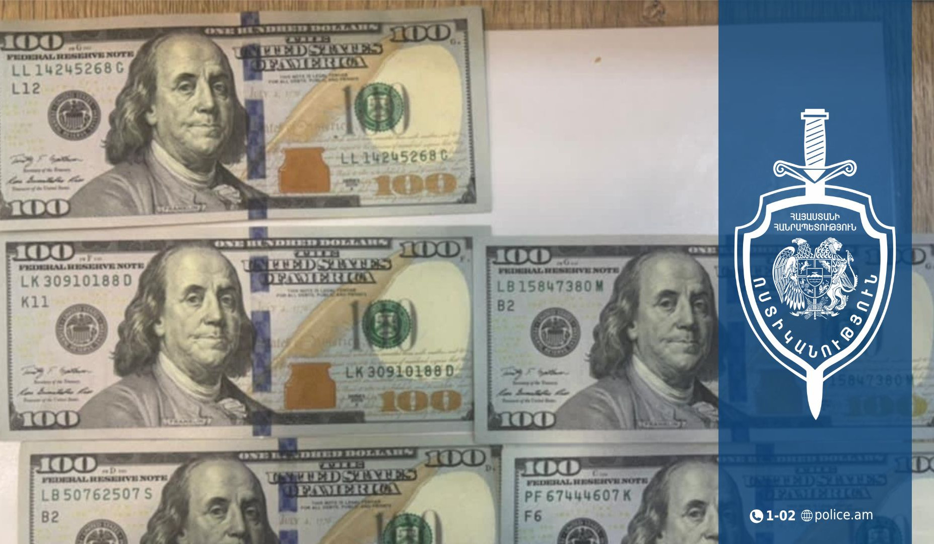 Քրեական ոստիկանության Շիրակի մարզային վարչությունում հունվարի 28-ին օպերատիվ տեղեկություններ էին ստացվել, որ Գյումրիի բնակիչ 21 և 24 տարեկան երկու երիտասարդ զբաղվում են կեղծ թղթադրամների իրացմամբ։ Ըստ տեղեկության՝ նրանք հունվարի 22-ին կեղծ 100-դոլարանոց է իրացրել Գյումրիի Խորենացու փողոցի սուպերմարկետներից մեկի տարադրամի փոխանակման կետում։