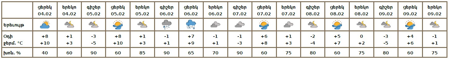 Օդի ջերմաստիճանը փետրվարի 5-6-ին գիշերն աստիճանաբար կբարձրանա 2-4 աստիճանով։
