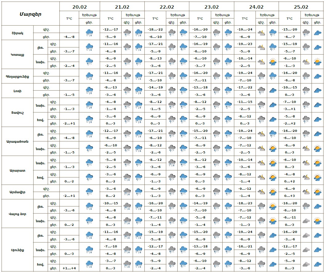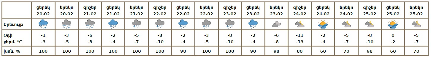 Փետրվարի 20-ի ցերեկը, 21-23-ին շրջանների զգալի մասում, 24-25-ին՝ հանրապետության առանձին շրջաններում սպասվում է ձյուն, 20-ի ցերեկը, 21-ին առանձին հատվածներում՝ շատ առատ, լեռնային առանձին շրջաններում՝ բուք, ցածր հորիզոնական տեսանելիություն։