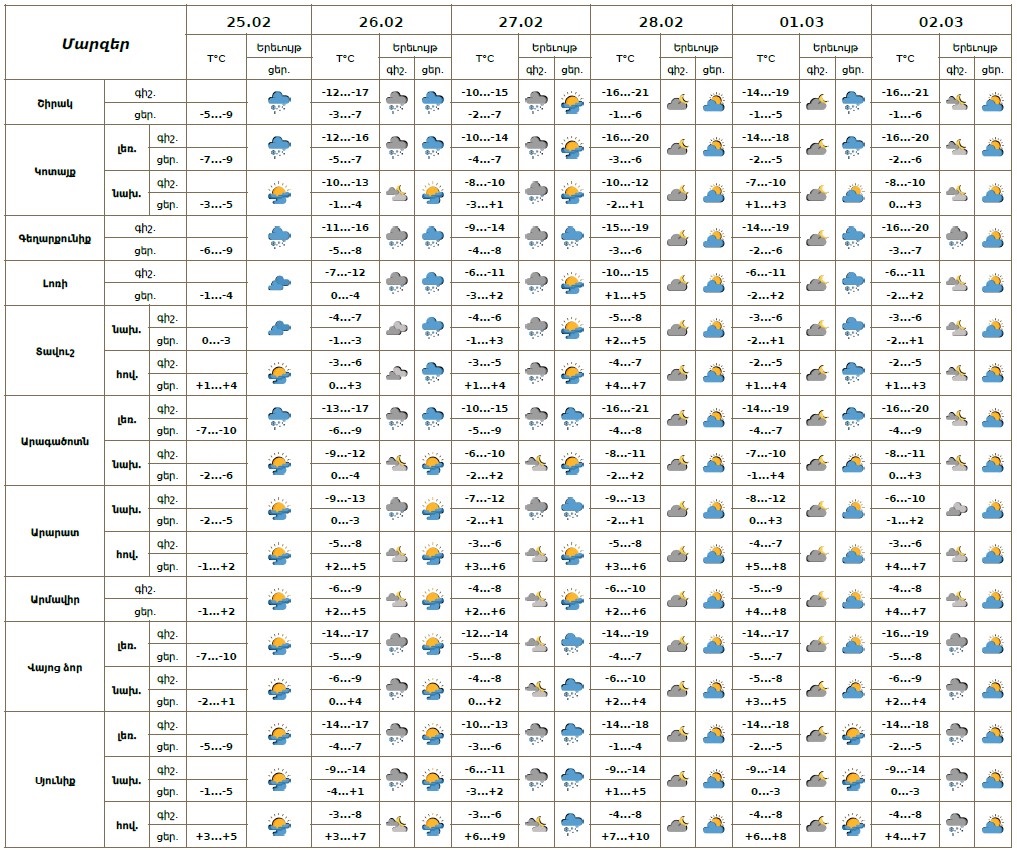 Փետրվարի 25-ի ցերեկը, 28-ին, մարտի 1-ի գիշերը, 2-ին սպասվում է առանց տեղումների եղանակ։ Փետրվարի 26-ի գիշերը և երեկոյան, 27-ի գիշերը, մարտի 1-ի երեկոյան սպասվում է թույլ ձյուն։