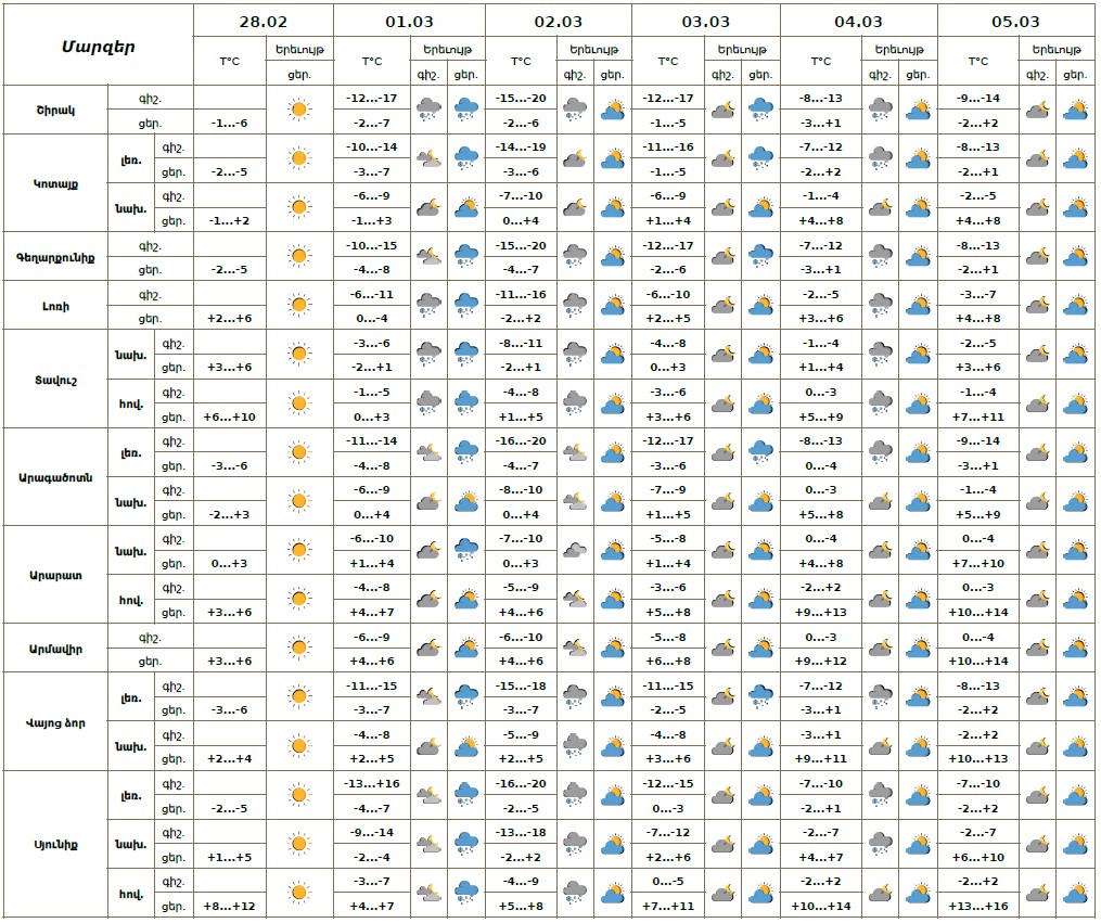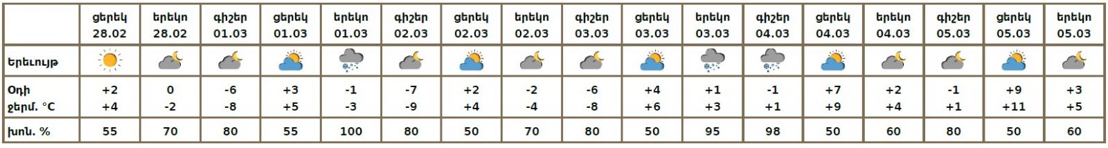 Փետրվարի 28-ի և մարտի 2-ի ցերեկը, 3-ի գիշերը, մարտի 5-ին հանրապետությունում սպասվում է առանց տեղումների եղանակ։ Մարտի 1-ին, 2-ի գիշերը, 3-ի երեկոյան, 4-ի գիշերն առանձին շրջաններում սպասվում է ձյուն: