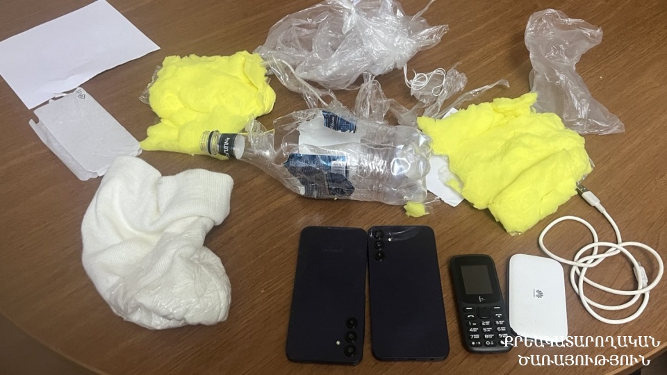 Ծառայողներն անմիջապես զննել են նշված հատվածը և հայտնաբերել ներնետված փաթեթը, որում առկա են եղել պլաստմասսայե շշի մեջ սպունգով փաթեթավորված 3 բջջային հեռախոս, wi-fi սարք և լիցքավորման լար։