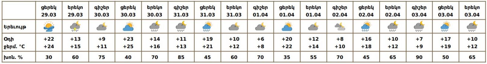 Հանրապետության տարածքում մարտի 29-ի ցերեկը, 30-31-ին, ապրիլի 2-3-ին օրվա ընթացքում առանձին շրջաններում սպասվում է կարճատև անձրև, 29-31-ի ցերեկը՝ նաև ամպրոպ։
