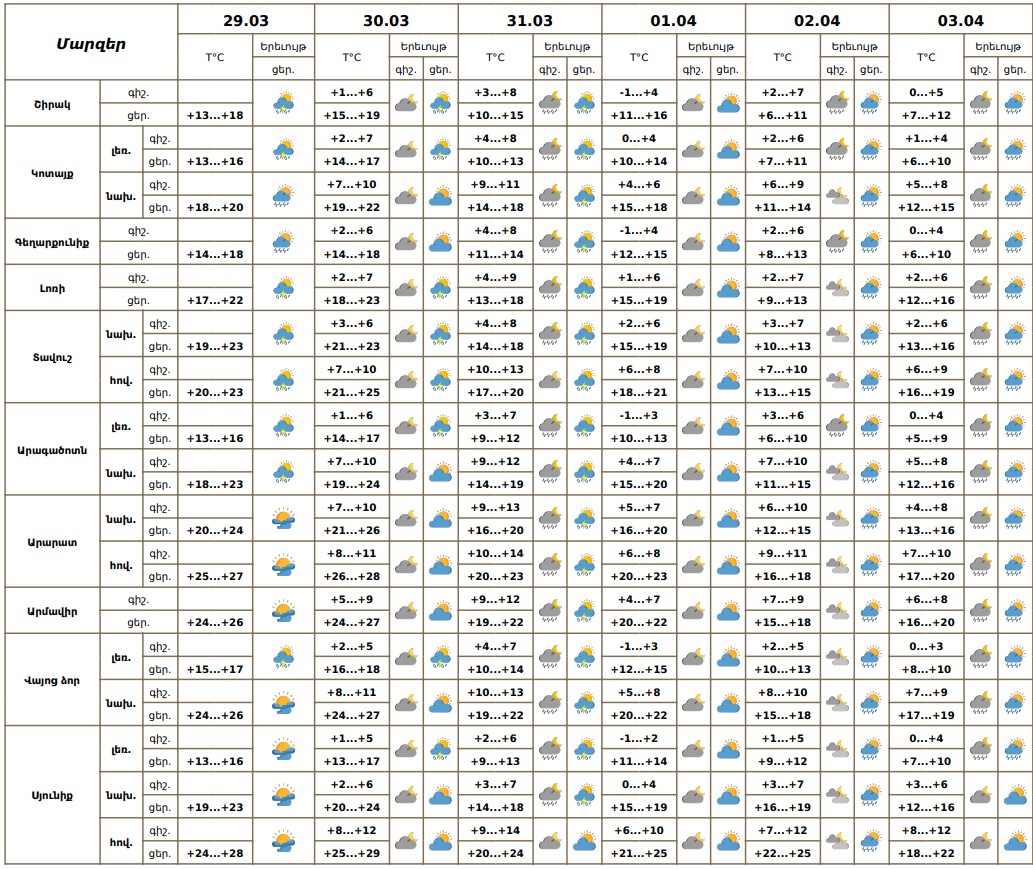 Օդի ջերմաստիճանը մարտի 29-30-ի ցերեկային ժամերին աստիճանաբար կբարձրանա ևս 2-4 աստիճանով։