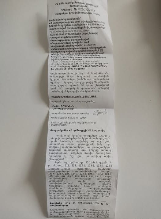 ԶԼՄ հաղորդումների հիման վրա պարեկային ծառայությունը տուգանել է Սարիկ Մինասյանի մեքենան վարած վարորդին` մեքենայում մինչև 7 տարեկան երեխա առանց երեխայի քաշին և հասակին համապատասխանող մանկական պահող համակարգերի օգտագործման համար։