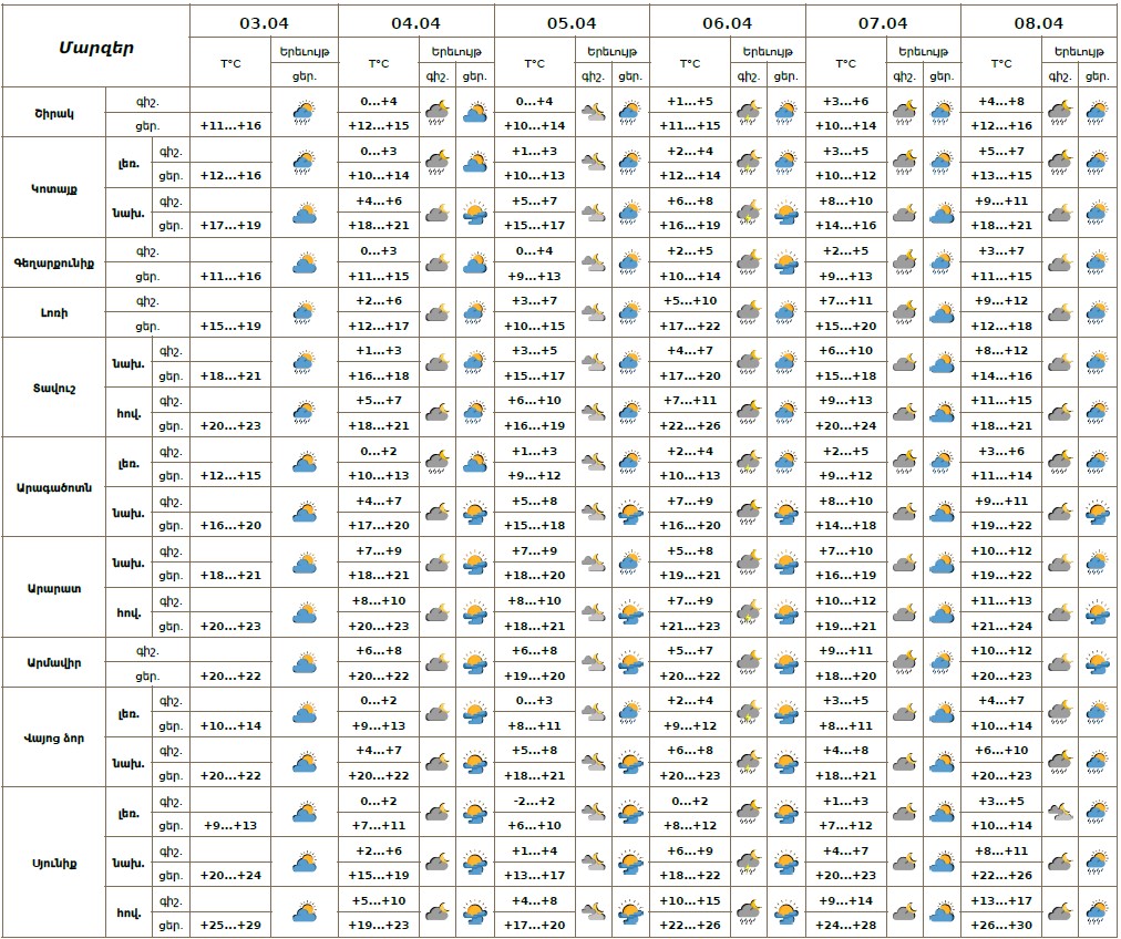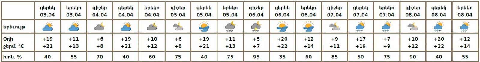 Ապրիլի 3-ի ցերեկը, 4-8-ին հանրապետության առանձին շրջաններում, օրվա ընթացքում սպասվում է կարճատև անձրև, հնարավոր է նաև ամպրոպ։