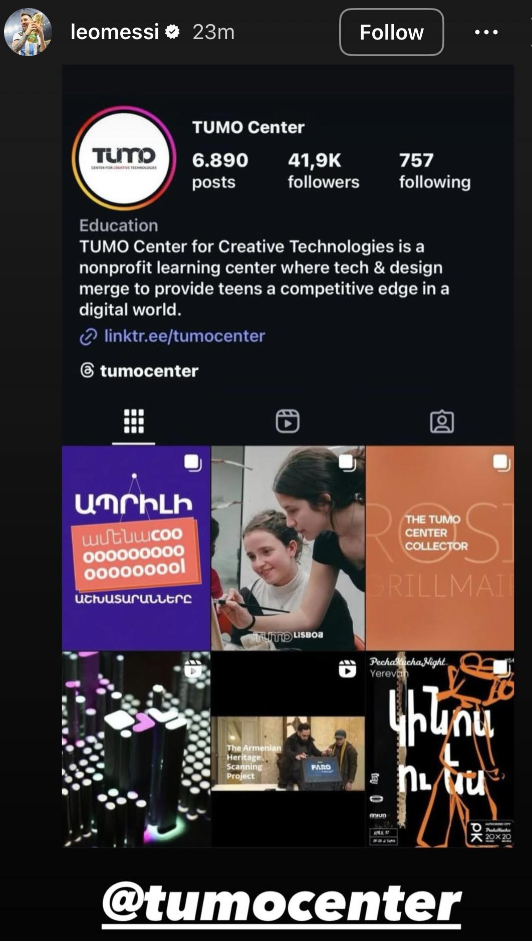 Արգենտինայի ֆուտբոլի ազգային հավաքականի ավագ և ամերիկյան «Ինտեր Մայամի» ֆուտբոլային ակումբի ֆուտբոլիստ Լիոնել Մեսսին ինստագրամյան իր էջի «Սթորի» բաժնում Թումո ստեղծարար տեխնոլոգիաների կենտրոնի վերաբերյալ հրապարակում է արել՝ կիսվել է էջով։