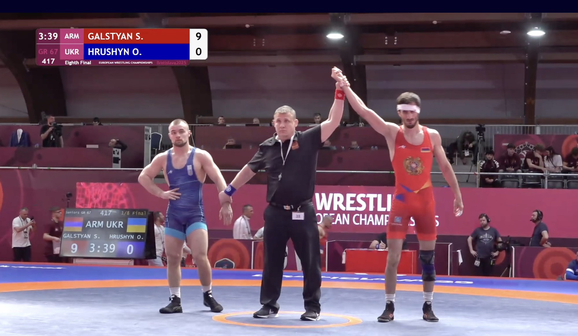 Իսկ հունահռոմեական ոճի ըմբշամարտի Եվրոպայի առաջնությունում Հայաստանի ներկայացուցիչ Սլավիկ Գալստյանը 1/8 եզրափակիչում 9:0 հաշվով պարտության մատնեց Եվրոպայի փոխչեմպիոն, ուկրաինացի Օլեքսանդր Հրուշինին (Oleksandr Hrushyn):