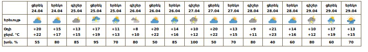 Երևան քաղաքում ապրիլի 24-ի, 26-ի և 27-ի ցերեկը, 28-ին սպասվում է առանց տեղումների եղանակ։ Ապրիլի 25-ին, 26-ի երեկոյան, 27-ի գիշերը, 29-ին սպասվում է անձրև և ամպրոպ, ամպրոպի ժամանակ՝ քամու ուժգնացում 17-20 մ/վ արագությամբ: