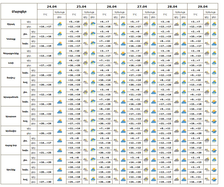 Հանրապետության տարածքում ապրիլի 24-ի ցերեկը, 26-ի և 27-ի ցերեկը, 28-29-ին առանձին շրջաններում, 25-ին, 27-ի գիշերը շրջանների զգալի մասում սպասվում է անձրև և ամպրոպ, 25-ին առանձին վայրերում՝ հորդառատ։ Քամին՝ հարավարևմտյան՝ 2-5մ/վ, ամպրոպի ժամանակ սպասվում է քամու ուժգնացում՝ 18-22 մ/վ արագությամբ։ Օդի ջերմաստիճանն ապրիլի 24-ի ցերեկը կբարձրանա 4-5 աստիճանով, 25-ի ցերեկը կնվազի 2-3 աստիճանով։