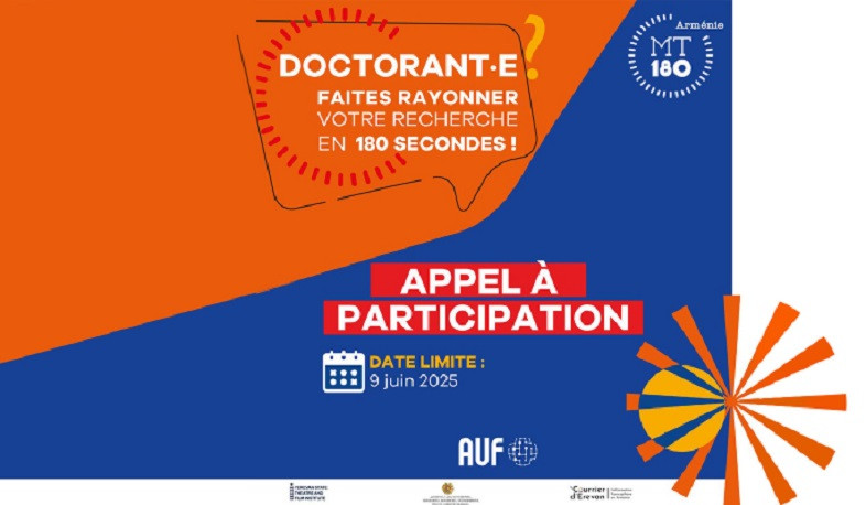 Ֆրանկոֆոնիայի համալսարանական գործակալության (AUF) ներկայացուցչության նախաձեռնությամբ հունիսի 19-ին Հայաստանում կմեկնարկի «Իմ թեկնածուական ատենախոսությունը 180 վայրկյանում» հանրահայտ միջազգային մրցույթի ազգային փուլը: Այդ մասին հայտնում են ԿԳՄՍՆ-ից: