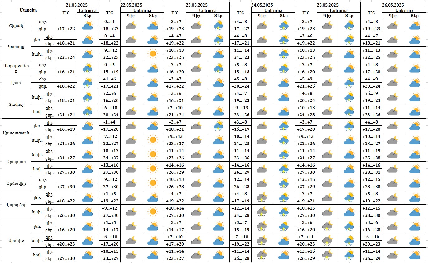 Մայիսի 21-ի ցերեկը, 23-25-ին կեսօրից հետո հանրապետության առանձին շրջաններում սպասվում են կարճատև անձրև և ամպրոպ։ Մայիսի 22-ին և 26-ին սպասվում է առանց տեղումների եղանակ։ Քամին՝ հարավարևմտյան՝ 2-5 մ/վ, ամպրոպի ժամանակ սպասվում է քամու ուժգնացում՝ 17-20 մ/վ արագությամբ։ Օդի ջերմաստիճանն էապես չի փոխվի։