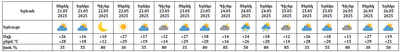 Երևանում մայիսի 21-ի ցերեկը, 22-ին և 25-26-ը սպասվում է առանց տեղումների եղանակ։ Մայիսի 24-ի ցերեկը սպասվում են կարճատև անձրև և ամպրոպ, ամպրոպի ժամանակ քամու ուժգնացում՝ 13-15 մ/վ արագությամբ։