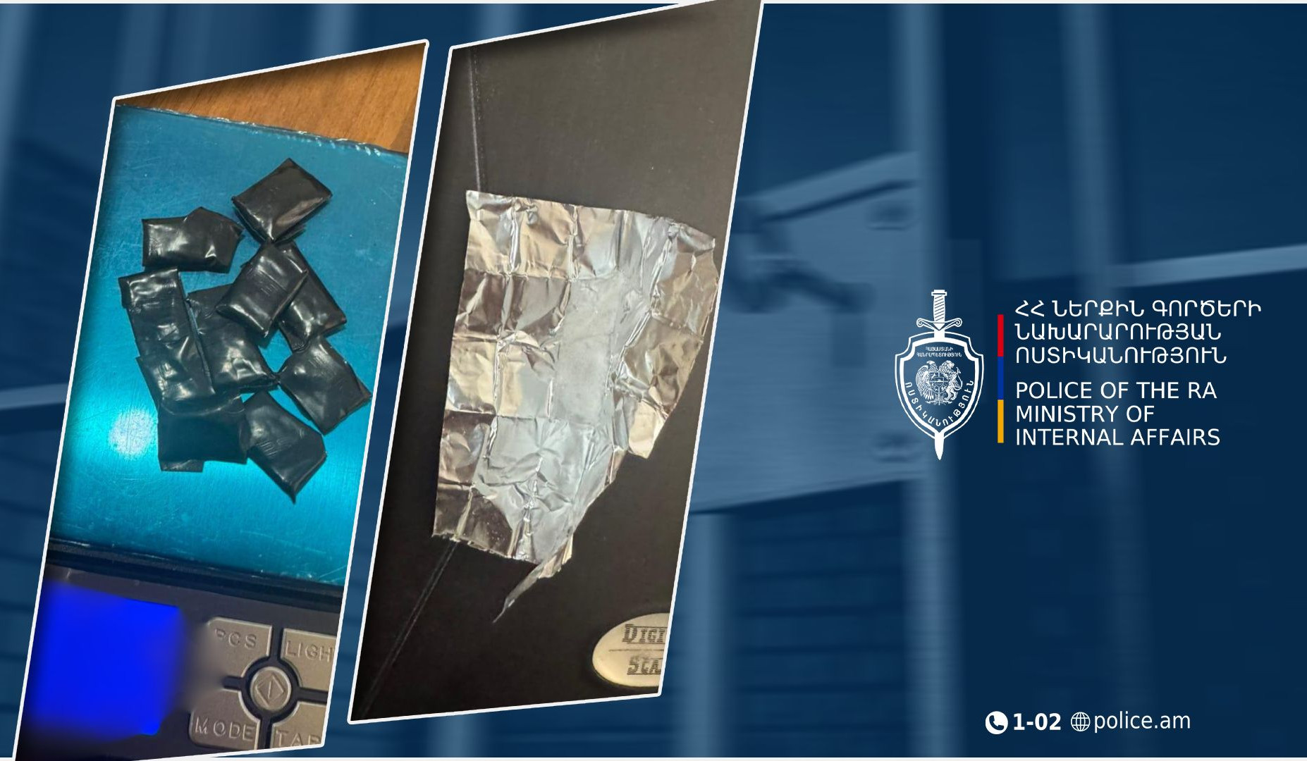 Երևանի պարեկները մայիսի 21-ին թմրամիջոց ձեռք բերելու, պահելու և իրացնելու կասկածանքով Դավթաշենի 2-րդ թաղամասում ձերբակալել և «Օպել» մակնիշի մեքենայով հանդերձ՝ Համայնքային ոստիկանության Դավթաշենի բաժին են տեղափոխել 30 և 32-ամյա երկու քաղաքացու: