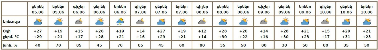 Երևան քաղաքում հունիսի 5-ի ցերեկը, 7-10-ը սպասվում է առանց տեղումների եղանակ։ Հունիսի 6-ին՝ կեսօրից հետո, հնարավոր է կարճատև անձրև և ամպրոպ, ամպրոպի ժամանակ՝ քամու ուժգնացում՝ 15-18 մ/վ արագությամբ։