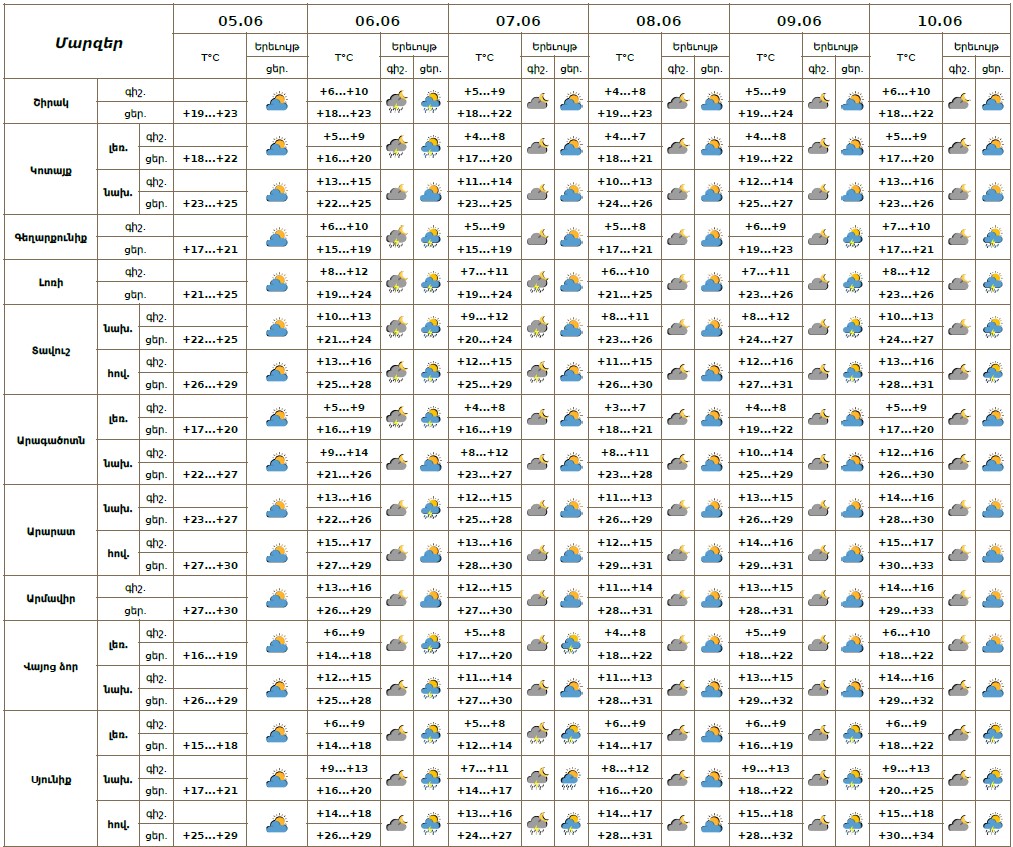 Օդի ջերմաստիճանը հունիսի 5-ի ցերեկը, 6-10-ը աստիճանաբար կբարձրանա 4-6 աստիճանով։