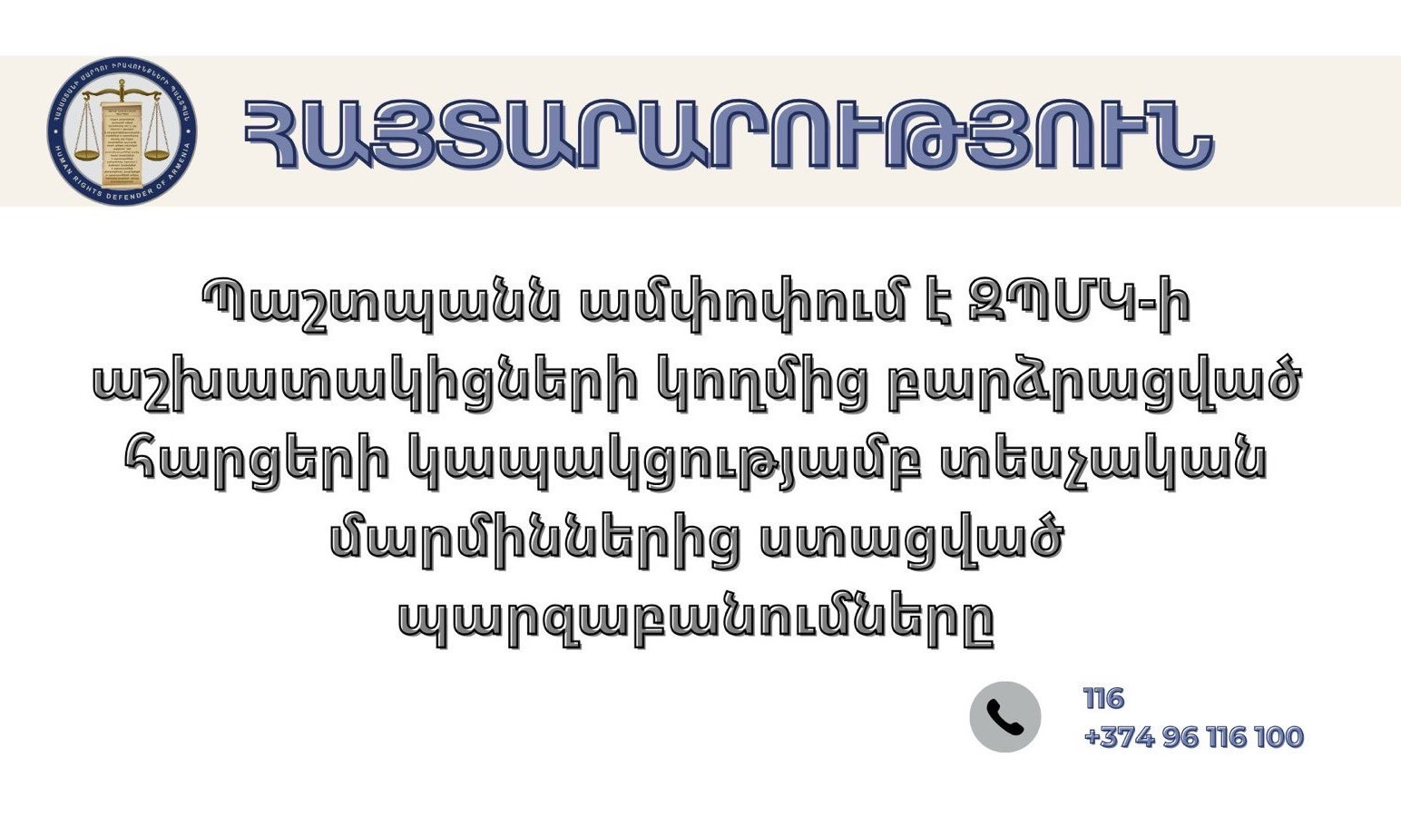 Պաշտպանն ընդգծում է, որ Հայաստանի Հանրապետությունում բազմաթիվ են խնդիրները աշխատանքային իրավունքներին առնչվող խնդիրերը բարձրաձայնելու կառուցակարգերի առումով: Ուստի, անհրաժեշտ է հրատապ քայլեր ձեռնարկել` երաշխավորելու, որպեսզի յուրաքանչյուր ոք հնարավորություն ունենա բարձրաձայնելու աշխատանքային իրավունքներին առնչվող խնդիրները, արդյունքում` ստանալով խնդիրների համար համարժեք լուծումներ: