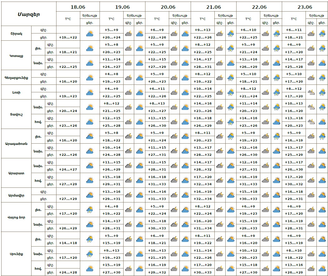 Օդի ջերմաստիճանը հունիսի 18-ի ցերեկը, 19-20-ը աստիճանաբար կբարձրանա 5-7 աստիճանով։