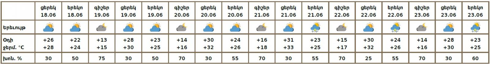 Երևանում հունիսի 18-ի ցերեկը, 19-20-ը սպասվում է առանց տեղումների եղանակ։ Հունիսի 21-23-ին երեկոյան ժամերին քաղաքի առանձին հատվածներում հնարավոր են կարճատև անձրև և ամպրոպ, ամպրոպի ժամանակ քամու ուժգնացում՝ 15-18 մ/վ արագությամբ։