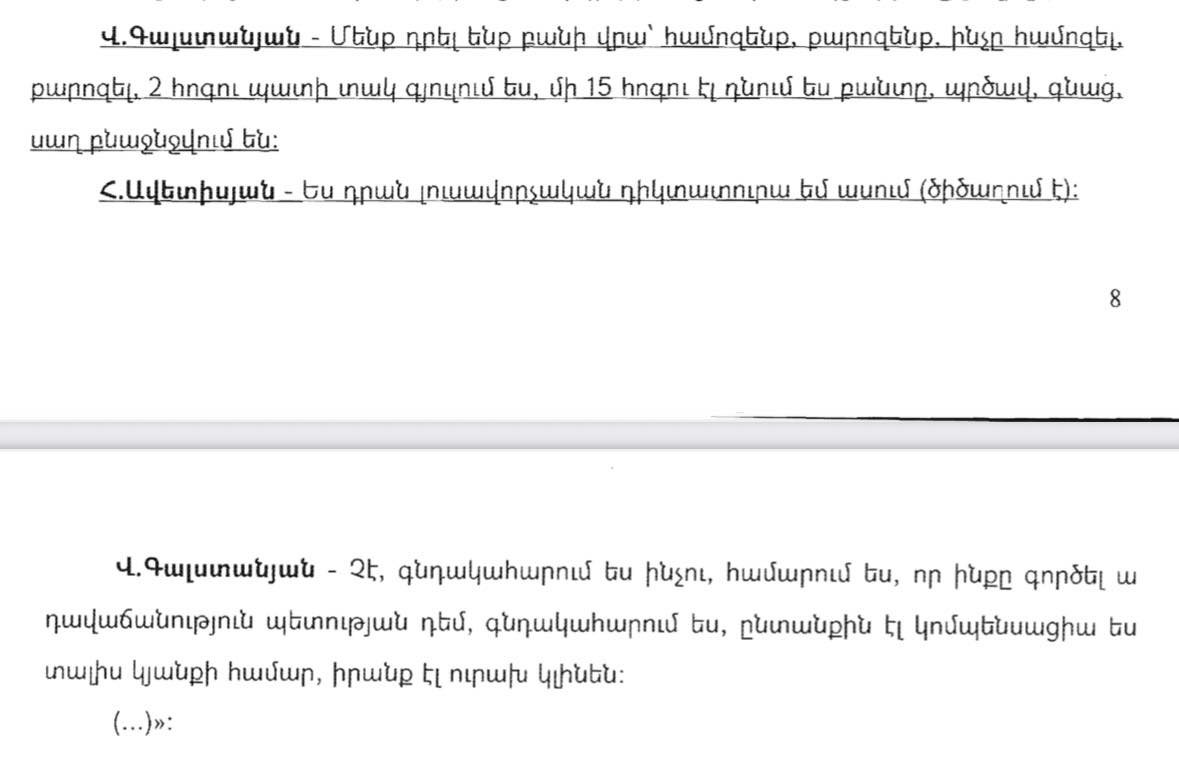 Գրառմանը կից՝ նա հրապարակել է հատված «Սրբազան պայքար» շարժման առաջնորդ Բագրատ Գալստանյանի ու Հովհաննես Ավետիսյանի խոսակցությունից։