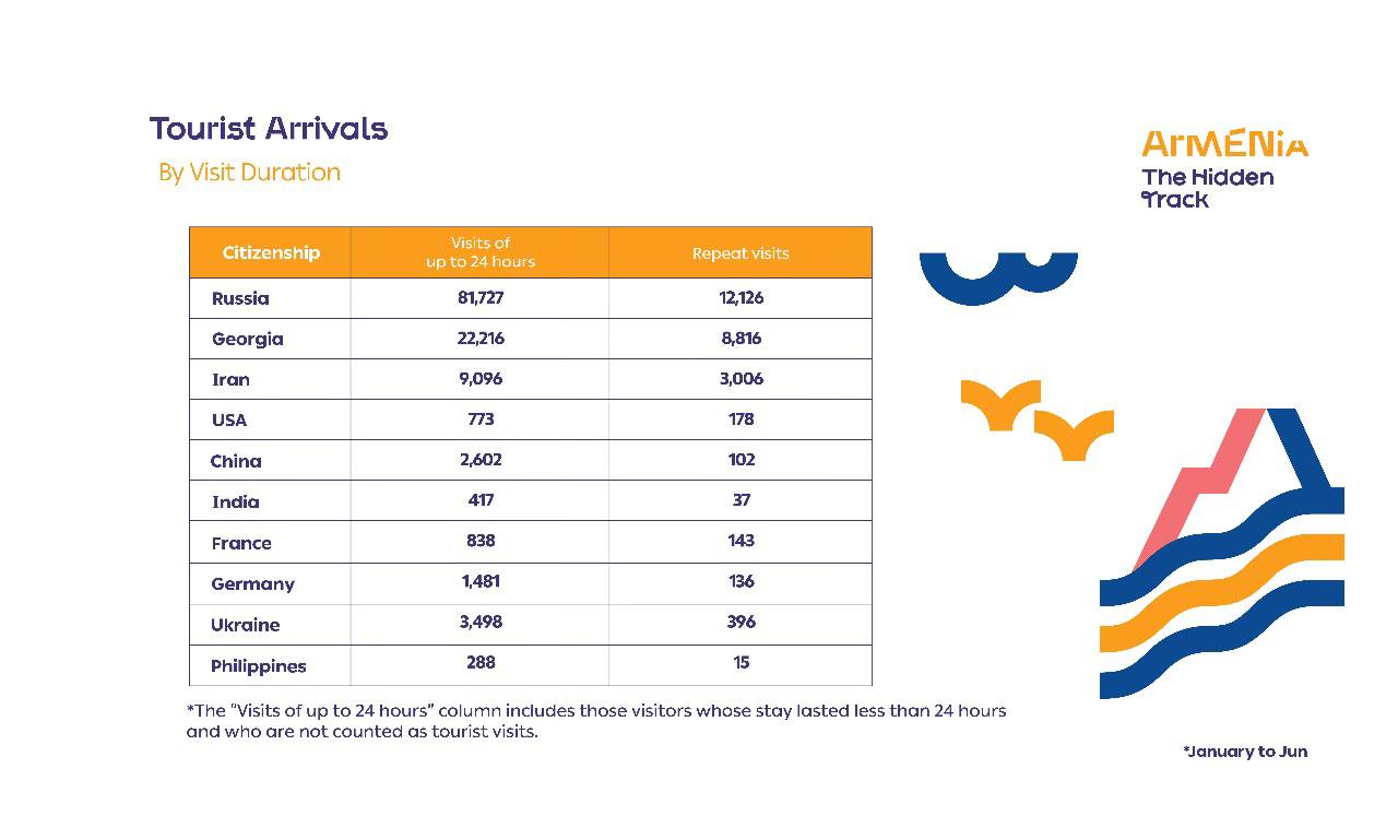 2025 թ․ հունվար-հունիս ամսին դեպի Հայաստան առավել շատ զբոսաշրջային այցելություններ գրանցվել են Ռուսաստանից (36.9%), Վրաստանից (14.4%) և Իրանից (8.5%):