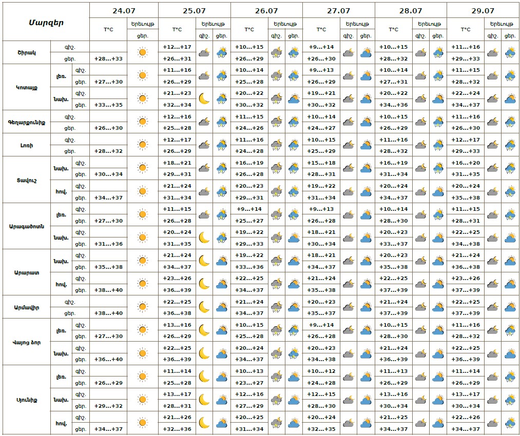 Հուլիսի 24-ի ցերեկը, 27-ին սպասվում է առանց տեղումների եղանակ։ Հուլիսի 25-ին և 28-29-ին կեսօրից հետո, 26-ին գիշերը և կեսօրից հետո առանձին շրջաններում սպասվում է կարճատև անձրև և ամպրոպ, հնարավոր է նաև կարկուտ։