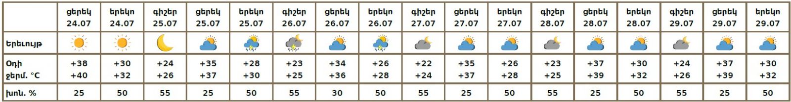 Երևանում՝ հուլիսի 24-ի ցերեկը, 25-ի գիշերը, 27-29-ին սպասվում է առանց տեղումների եղանակ։ Հուլիսի 25-ին երեկոյան ժամերին, 26-ի գիշերը և երեկոյան քաղաքի առանձին հատվածներում հնարավոր է կարճատև անձրև և ամպրոպ։ Ամպրոպի ժամանակ և երեկոյան սպասվում է քամու ուժգնացում 16-19մ/վ արագությամբ։
