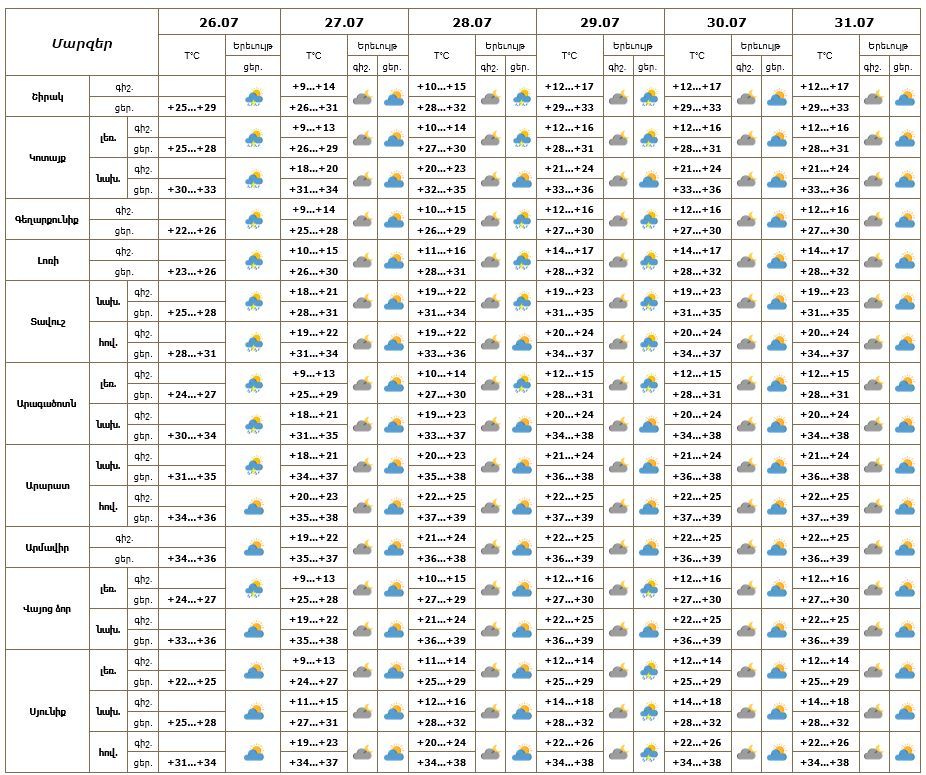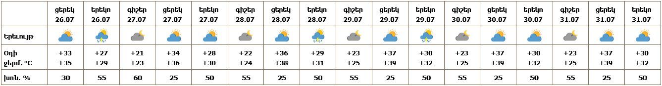 Երևանում հուլիսի 26-ին և 28-29-ի երեկոյան ժամերին քաղաքի առանձին հատվածներում հնարավոր է կարճատև անձրև և ամպրոպ։ Հուլիսի 27-ին և 30-31-ը սպասվում է առանց տեղումների եղանակ։ Ամպրոպի ժամանակ և երեկոյան սպասվում է քամու ուժգնացում 16-19 մ/վ արագությամբ։