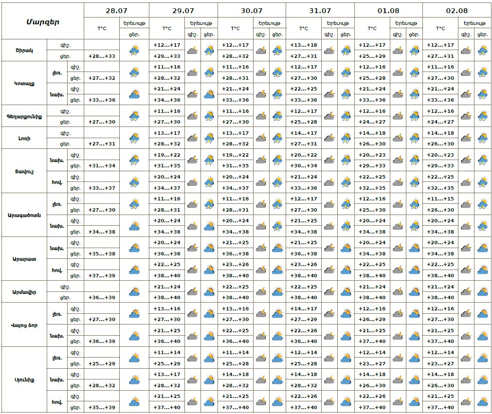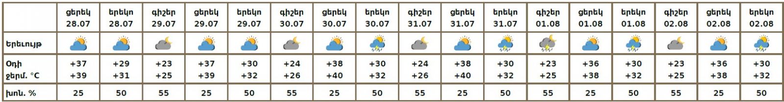 Երևանում՝ հուլիսի 28-ի ցերեկը, 29-ին սպասվում է առանց տեղումների եղանակ։ Հուլիսի 30-31-ին, օգոստոսի 1-2-ին սպասվում է կարճատև անձրև և ամպրոպ։ Ամպրոպի ժամանակ և երեկոյան ժամերին սպասվում է նաև քամու ուժգնացում 16-19 մ/վ արագությամբ։