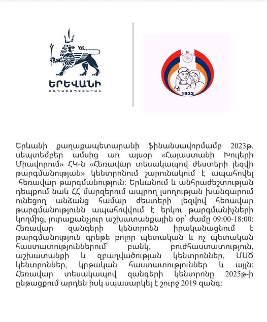 Ծրագիրը միտված է ապահովելու Երևանում և ՀՀ մարզերում հեռավար թարգմանության հասանելիությունը: