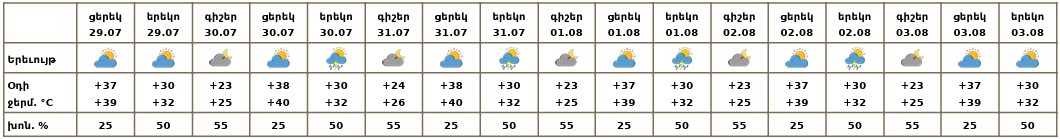 Երևան քաղաքում հուլիսի 29-ի ցերեկը, օգոստոսի 3-ին սպասվում է առանց տեղումների եղանակ։ Հուլիսի 30-31-ը, օգոստոսի 1-2-ին երեկոյան ժամերին քաղաքի առանձին հատվածներում հնարավոր է կարճատև անձրև և ամպրոպ, ամպրոպի ժամանակ քամու ուժգնացում 16-19 մ/վ արագությամբ։
