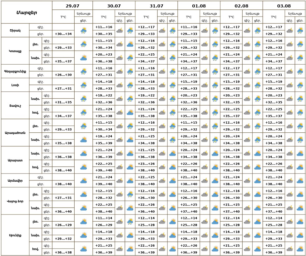 Հարավից արևադարձային տաք օդի ալիքի ներթափանցմամբ պայմանավորված՝ հուլիսի 29-31-ը, օգոստոսի 1-3-ին Արարատյան դաշտում, Վայոց ձորի նախալեռներում, Սյունիքի հովիտներում և Երևանում սպասվում է բարձր ջերմային ֆոն․ ցերեկը ժամը 16։00-17-00-ն ընկած ժամանակահատվածում՝ +38․․․+40 աստիճան տաքություն։ Նշված հատվածներում, ինչպես նաև Արագածոտնի և Կոտայքի նախալեռներում առաջիկա 5 օրերին սպասվում է նաև բարձր կարգի հրդեհավտանգ իրավիճակ։