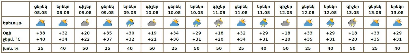 Երևան քաղաքում օգոստոսի 8-ի ցերեկը սպասվում է առանց տեղումների եղանակ։ Օգոստոսի 9-ի երեկոյան, 10-12-ին գիշերը և երեկոյան, 13-ին գիշերը քաղաքի առանձին հատվածներում հնարավոր է կարճատև անձրև և ամպրոպ, ամպրոպի ժամանակ և երեկոյան ժամերին սպասվում է քամու ուժգնացում՝ 14-18 մ/վ արագությամբ։