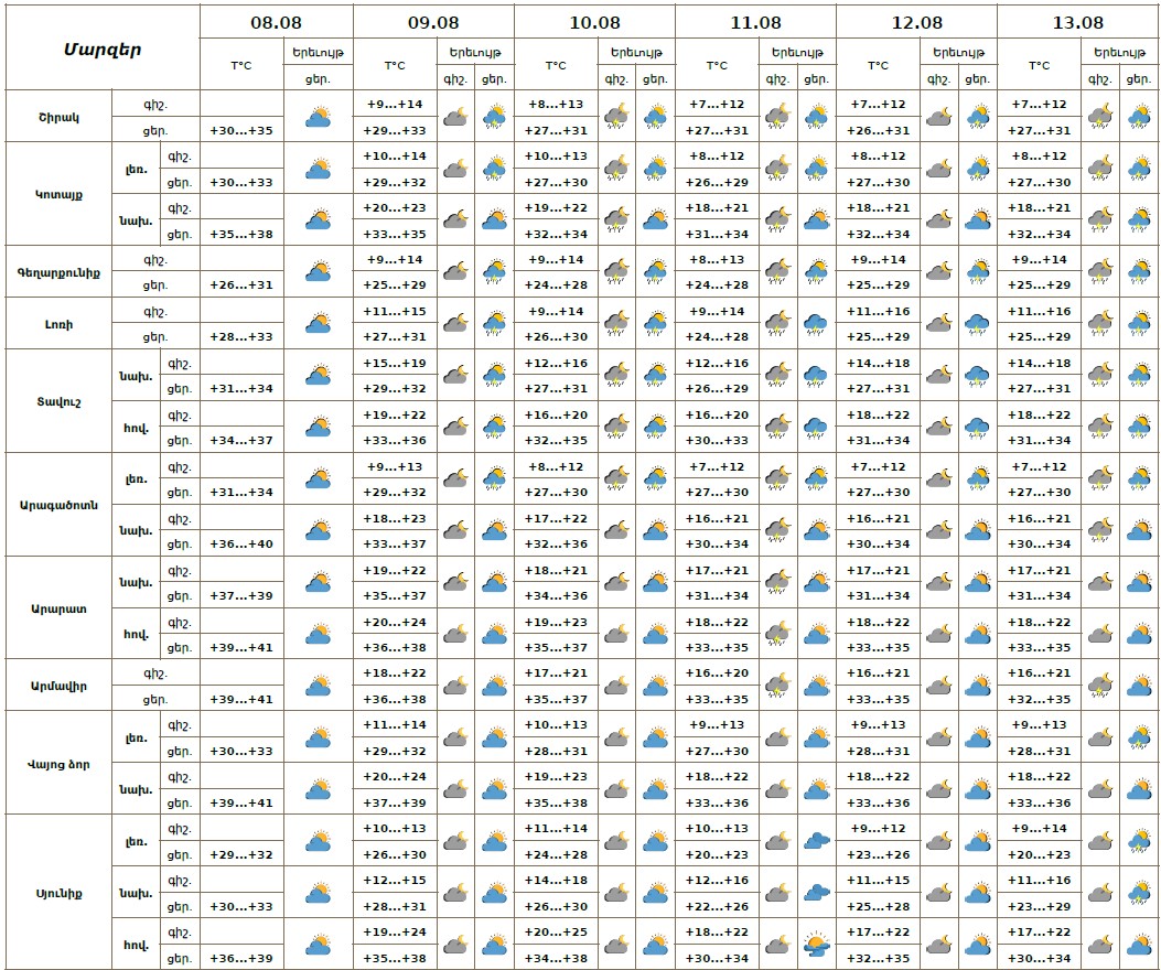 Օդի ջերմաստիճանն օգոստոսի 9-11-ը և գիշերը և ցերեկը աստիճանաբար կնվազի 4-6 աստիճանով: