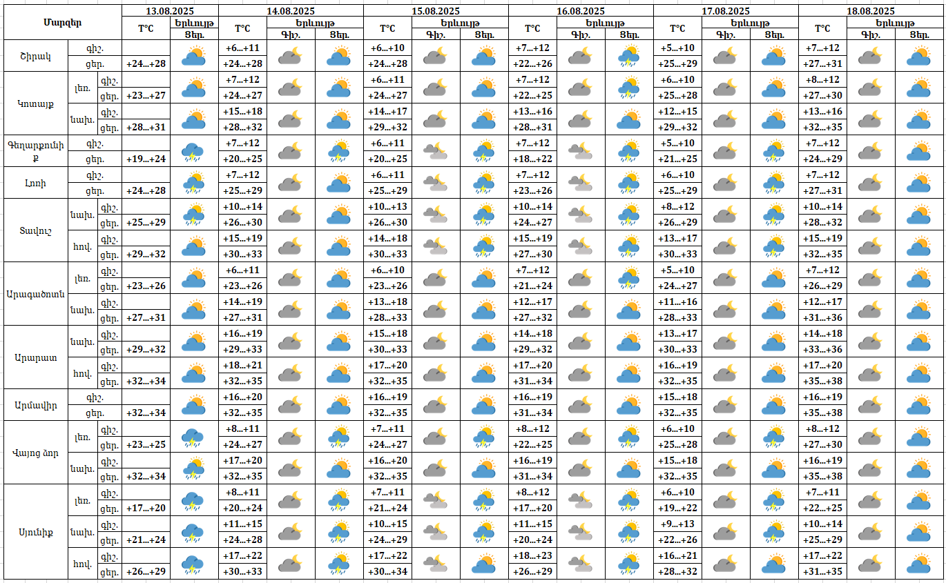 Երևանում օգոստոսի 13-ին և 16-ին երեկոյան քաղաքի առանձին հատվածներում հնարավոր են կարճատև անձրև և ամպրոպ։ Օգոստոսի 14-15-ին, 17-18-ին սպասվում է առանց տեղումների եղանակ։ Օգոստոսի 13-16-ին ամպրոպի ժամանակ և երեկոյան սպասվում է քամու ուժգնացում՝ 14-18 մ/վ արագությամբ։