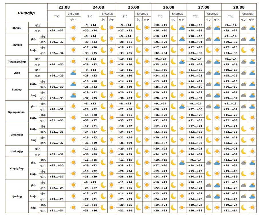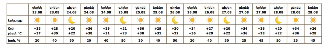 Օգոստոսի 23-ի ցերեկը, 24-28-ին սպասվում է առանց տեղումների եղանակ: Քամին՝ հարավարևմտյան, 2-5 մ/։ Օգոստոսի 25- 28-ին՝ երեկոյան ժամերին, Արմավիրում, Կոտայքի և Արագածոտնի նախալեռներում սպասվում է քամու ուժգնացում՝ 15-19 մ/վ արագությամբ։