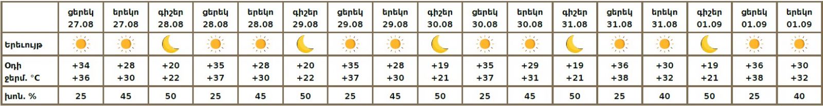 Երևան քաղաքում օգոստոսի 27-ի ցերեկը, 28-31-ը, սեպտեմբերի 1-ին սպասվում է առանց տեղումների եղանակ։ Օգոստոսի 27-29-ին երեկոյան սպասվում է քամու ուժգնացում՝ 14-18 մ/վ արագությամբ։