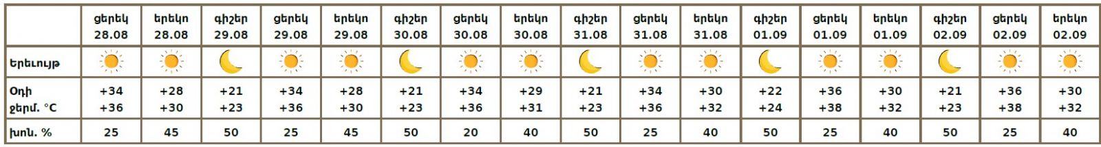 Երևան քաղաքում օգոստոսի 28-ի ցերեկը, 29-31-ը, սեպտեմբերի 1-2-ը սպասվում է առանց տեղումների եղանակ։ Օգոստոսի 28-29-ին՝ երեկոյան, սպասվում է քամու ուժգնացում՝ 14-18 մ/վ արագությամբ։