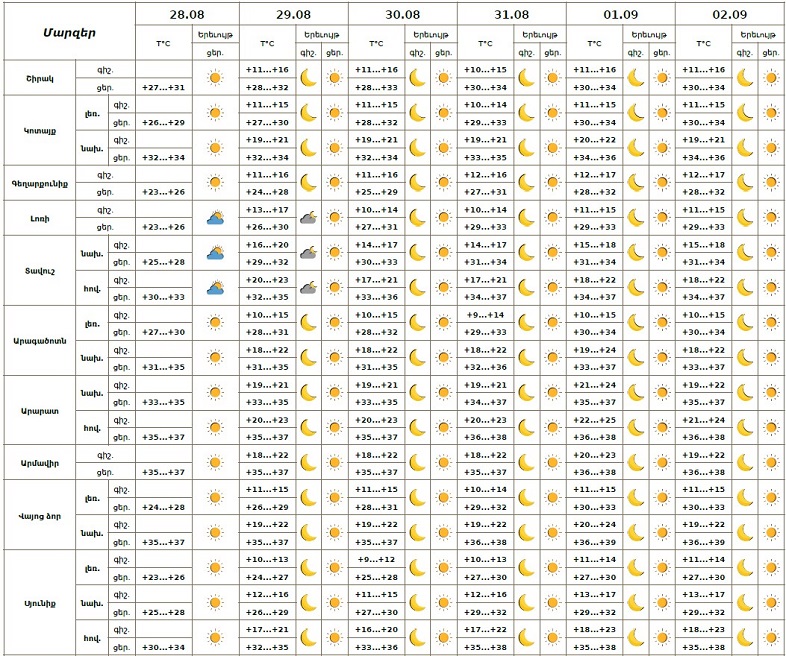 Հանրապետության տարածքում օգոստոսի 28-ի ցերեկը, 29-31-ը, սեպտեմբերի 1-2-ը սպասվում է առանց տեղումների եղանակ:
