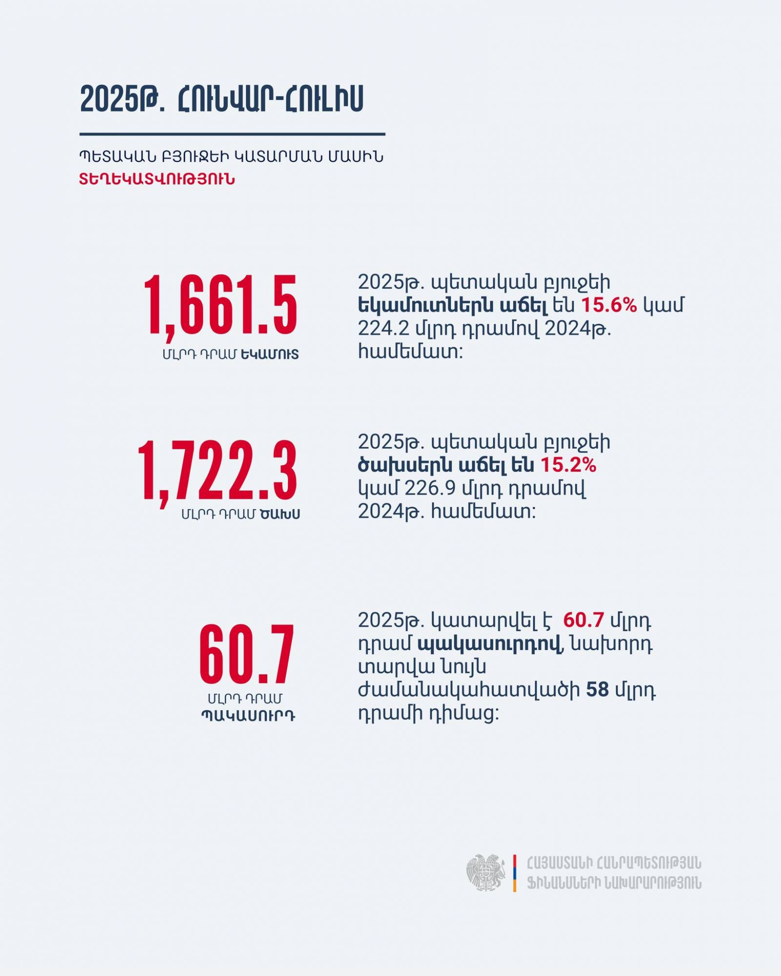 2025 թվականի հունվար-հուլիս ամիսների ընթացքում ՀՀ պետական բյուջեն կատարվել է 60.7 մլրդ դրամ պակասուրդով՝ նախորդ տարվա նույն ժամանակահատվածի 58 մլրդ դրամի դիմաց:
