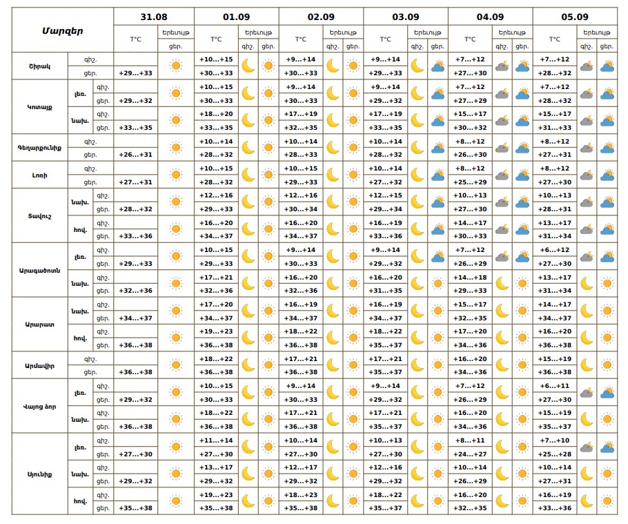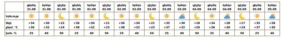 Օգոստոսի 31-ի ցերեկը, սեպտեմբերի 1-5-ին սպասվում է առանց տեղումների եղանակ: Քամին՝ հարավային 2-5 մ/վ։ Օդի ջերմաստիճանն օգոստոսի 31-ից սեպտեմբերի 2-ը աստիճանաբար կբարձրանա 2-5 աստիճանով։