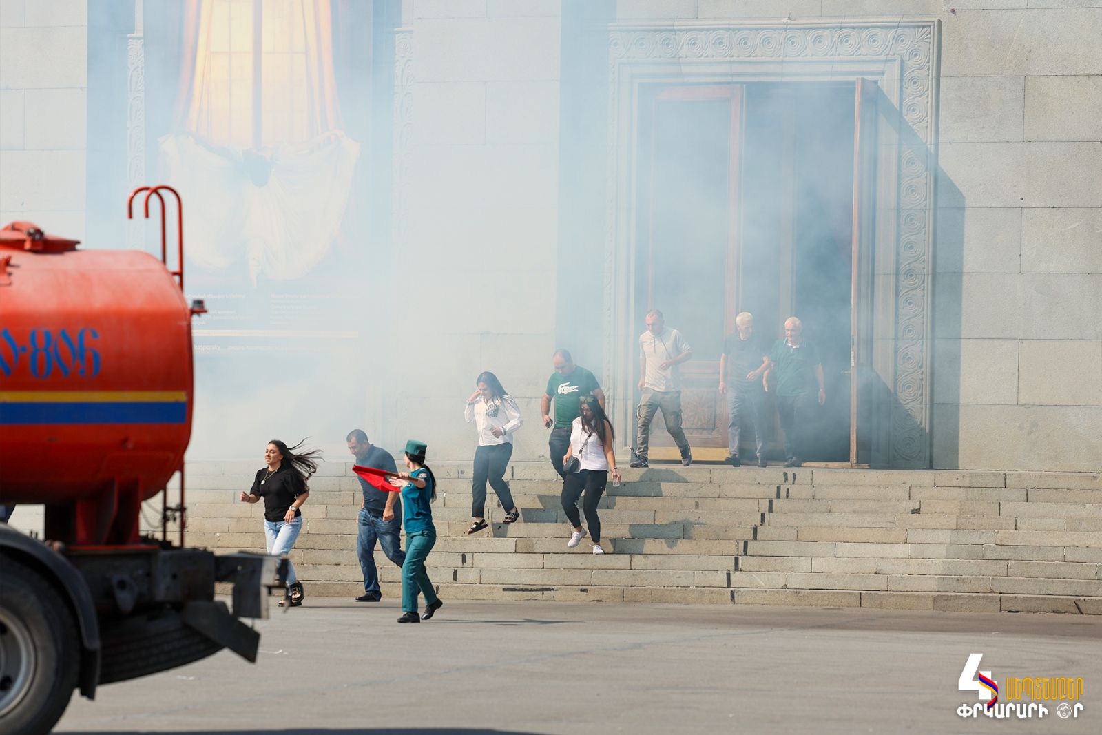 Հաղորդվում է դեպք-պատահարի մասին. օպերատիվորեն հրապարակ են ժամանում հրշեջ-փրկարարական ջոկատները։ Տարհանվում են թատրոնում մնացած քաղաքացիներն ու աշխատակիցները, վնասազերծվում է չպայթած արկը, դադարեցվում է քիմիական նյութի արտահոսքը, դուրս են բերվում ավտոմեքենայում արգելափակված քաղաքացիները, փլուզման հետևանքով տուժածին հատուկ սարքավորումներով օգնություն է ցուցաբերվում՝ փրկելով նրա կյանքը։