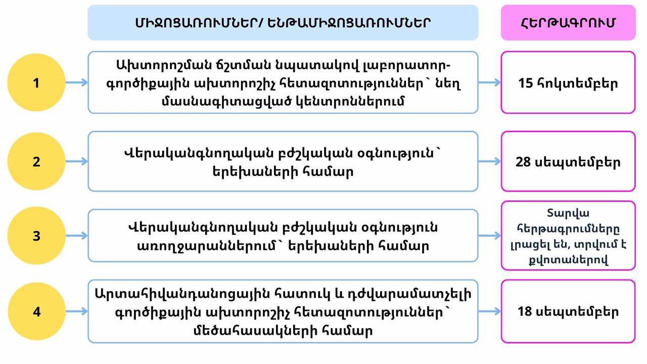 Առողջապահության նախարարությունից հայտնում են, որ վերջին օրերին պետական պատվերի շուրջ ստեղծված շահարկումները շատ են և քաղաքացիներին մոլորեցնող. ուստի ներկայացնում են առողջապահական այն ծրագրերն ու միջոցառումները, որոնք այս պահին հերթագրման ենթակա են: