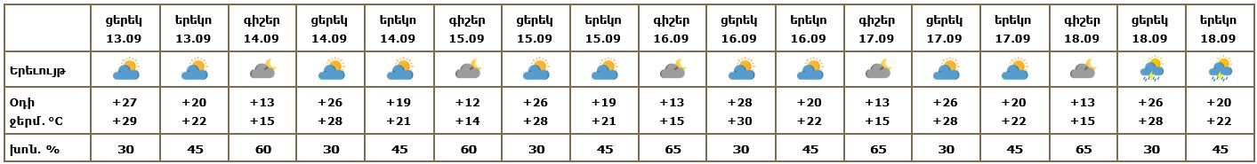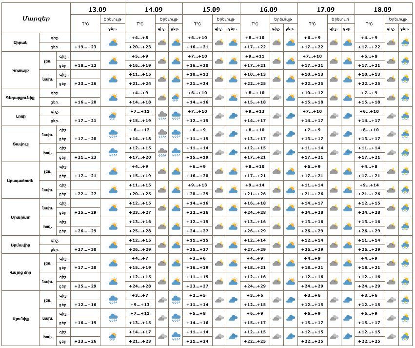 Հանրապետության տարածքում սեպտեմբերի 13-ի ցերեկը, 14-ին հանրապետության առանձին շրջաններում սպասվում է թույլ կարճատև անձրև։
