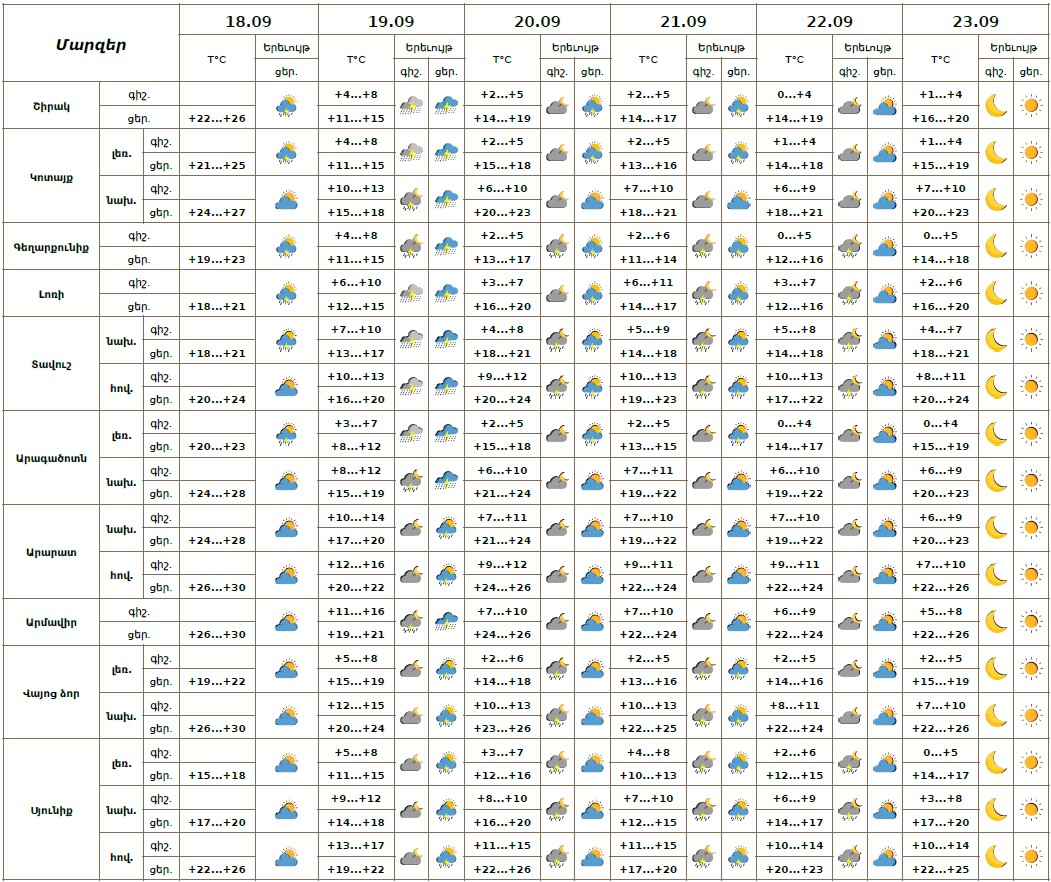Հանրապետության տարածքում սեպտեմբերի 18-ի երեկոյան, 19-ի գիշերը, 20-21-ին, 22-ի գիշերը առանձին շրջաններում սպասվում է կարճատև անձրև և ամպրոպ, 19-ի ցերեկը շրջանների մեծ մասում ժամանակ առ ժամանակ սպասվում է անձրև և ամպրոպ, առանձին հատվածներում անձրևները կլինեն հորդառատ, հնարավոր է կարկուտ։ Սեպտեմբերի 22-ի ցերեկը և 23-ին սպասվում է առանց տեղումների եղանակ։