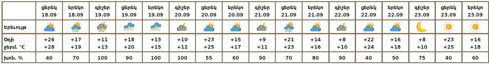 Երևան քաղաքում սեպտեմբերի 18-ի երեկոյան, 21-ի ցերեկը քաղաքի առանձին հատվածներում հնարավոր է կարճատև անձրև և ամպրոպ։ Սեպտեմբերի 19-ին ժամանակ առ ժամանակ սպասվում է անձրև և ամպրոպ, ամպրոպի ժամանակ սպասվում է քամու ուժգնացում` 15-17 մ/վ արագությամբ։ Սեպտեմբերի 20-ին, 22-23-ին սպասվում է առանց տեղումների եղանակ։