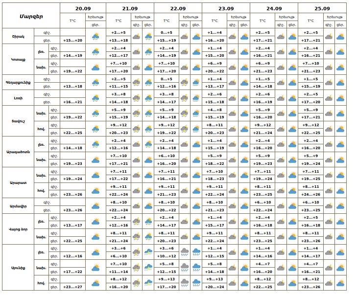 Օդի ջերմաստիճանը սեպտեմբերի 20-ի ցերեկը կբարձրանա 4-5 աստիճանով։