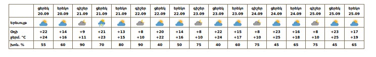 Սեպտեմբերի 21-ի ցերեկը քաղաքի առանձին հատվածներում հնարավոր է կարճատև անձրև և ամպրոպ, ամպրոպի ժամանակ սպասվում է քամու ուժգնացում՝ 15-17 մ/վ արագությամբ։