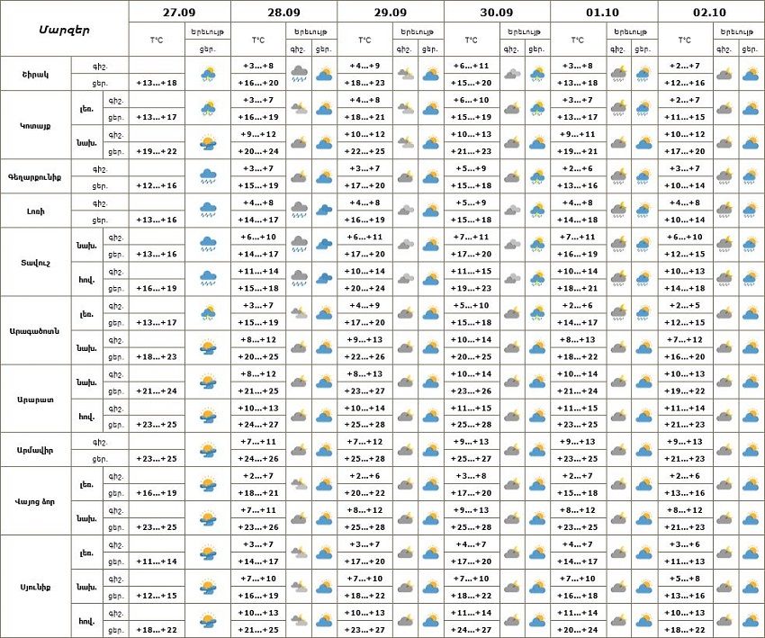 Օդի ջերմաստիճանը սեպտեմբերի 27-ի ցերեկը կնվազի 3-5 աստիճանով, սեպտեմբերի 28-29-ը աստիճանաբար նույնքան կբարձրանա։